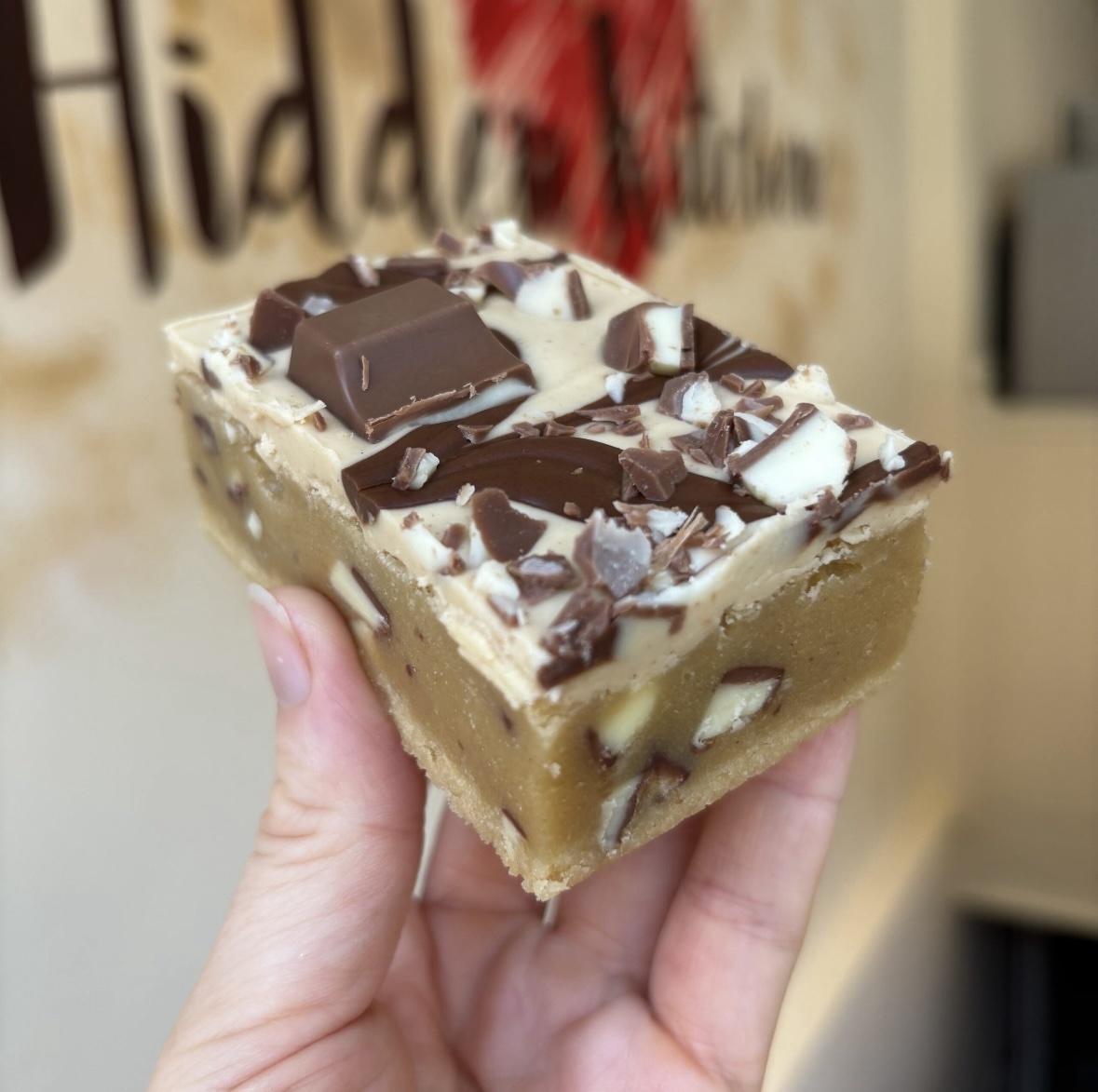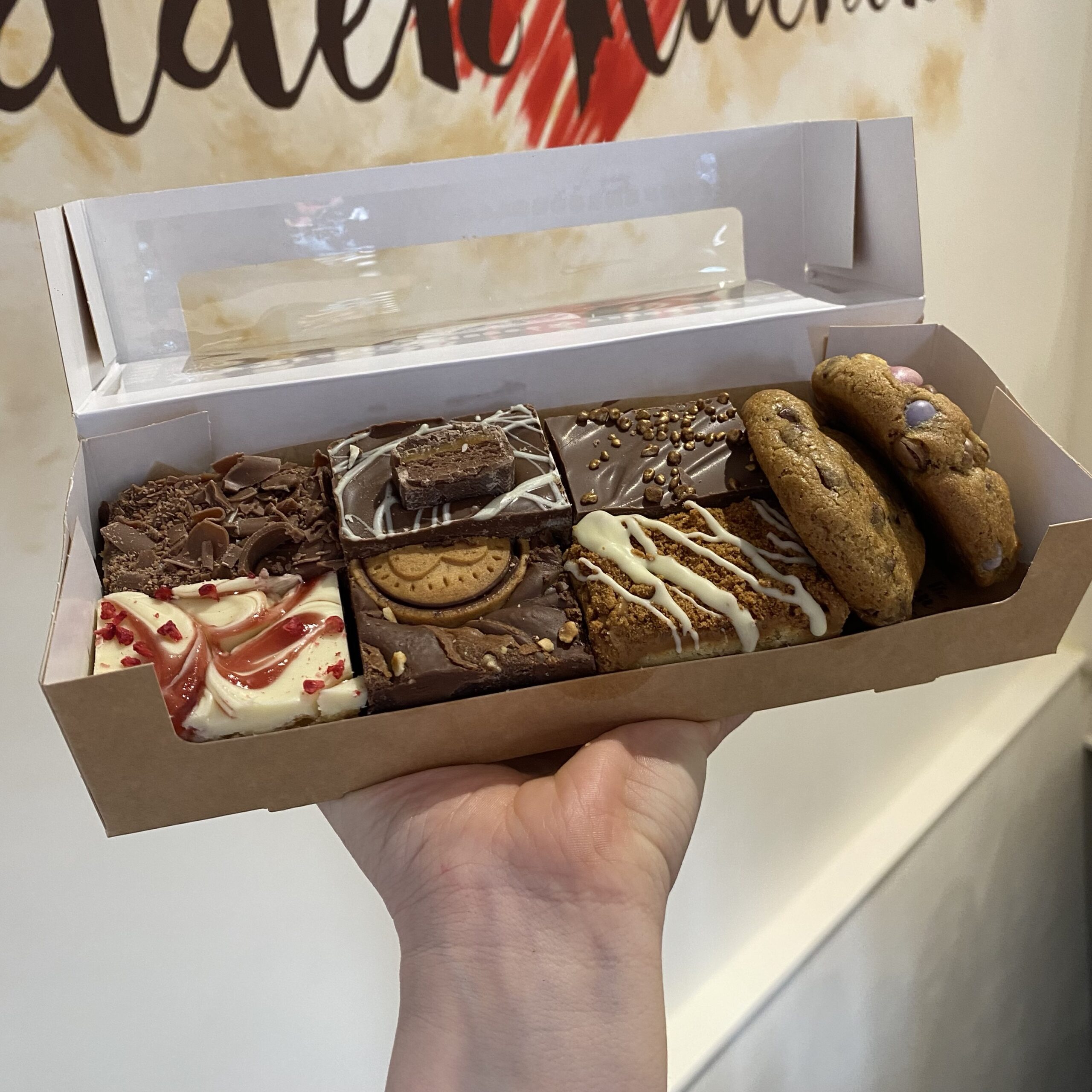 1 x Mini Kinder Blondie – Sugar, Eggs, White Chocolate, Butter, Flour, Salt, Kinder Chocolate, Milk Chocolate, White Chocolate Spread, Milk Chocolate Spread