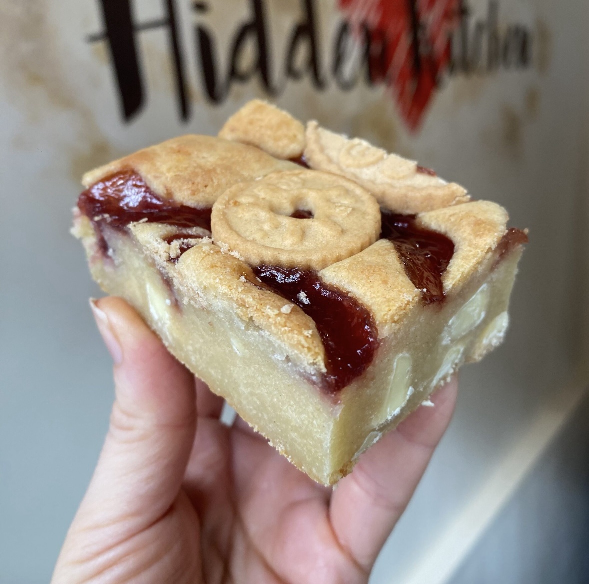 1 x Mini Jammie Blondie – Sugar, Eggs, White Chocolate, Butter, Salt, Flour, White Chocolate Spread, Raspberry Jam, Jammie Dodgers