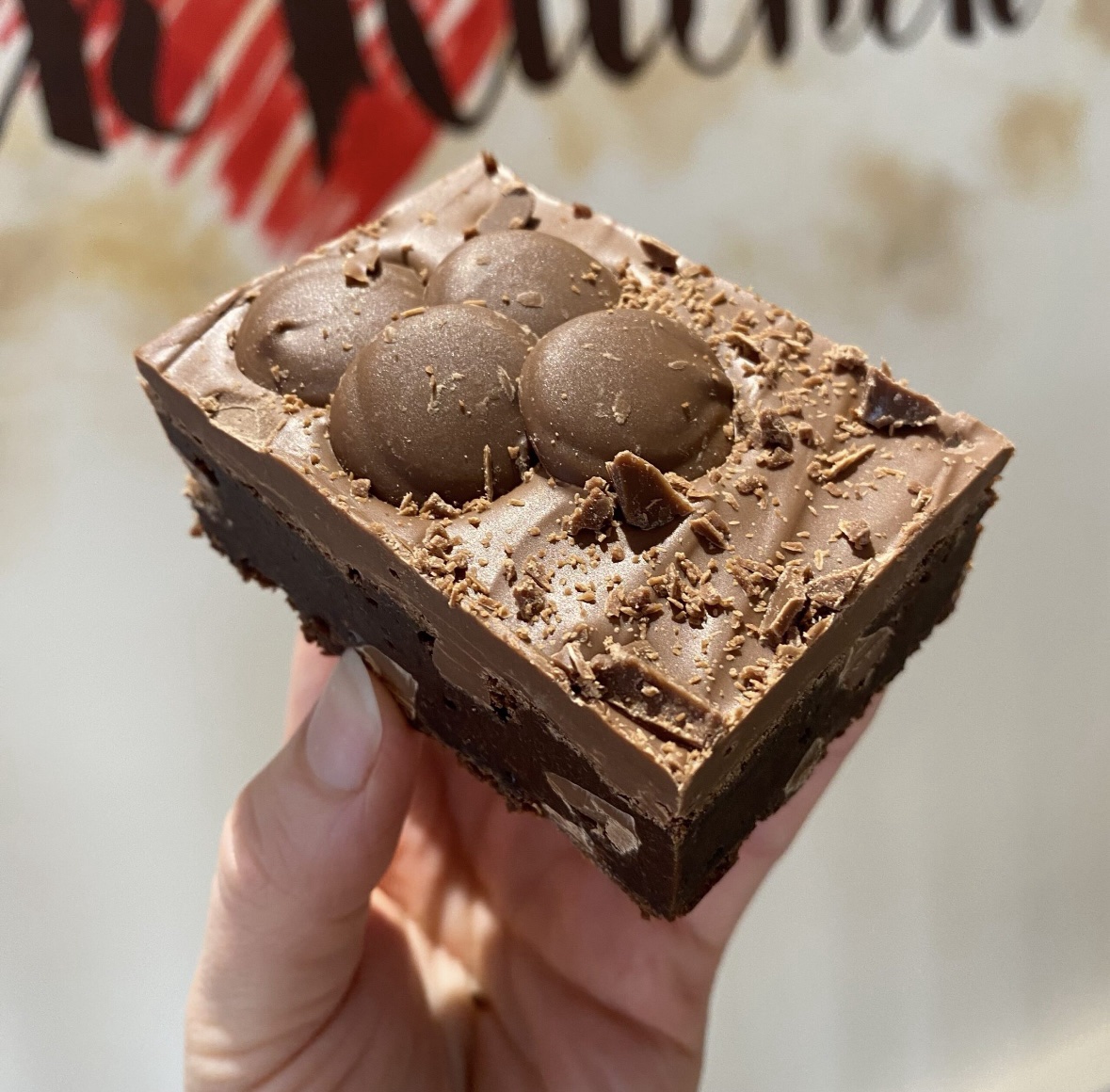 1 x Mini Cadburys Buttons Brownie – Sugar, Eggs, Dark Chocolate, Butter, Salt, Flour, Cocoa Powder, Cadburys Spread, Dairy Milk Bar, Cadburys Buttons