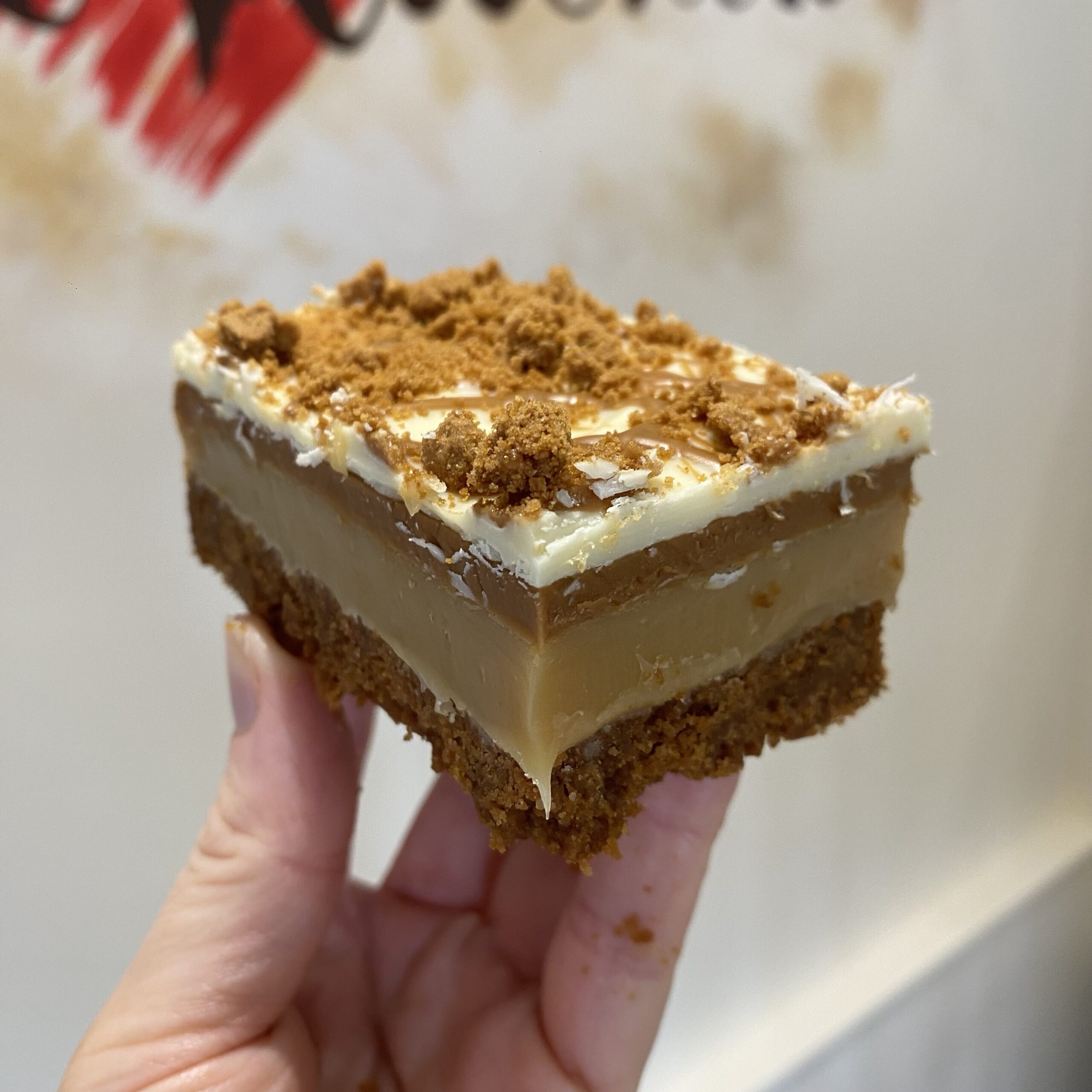 1 x Mini Biscoff Millionaire Slice – Sugar, Condensed Milk, White Chocolate, Flour, Butter, Salt, Lotus Biscoff Spread, Lotus Biscuits, Malteser Bunny