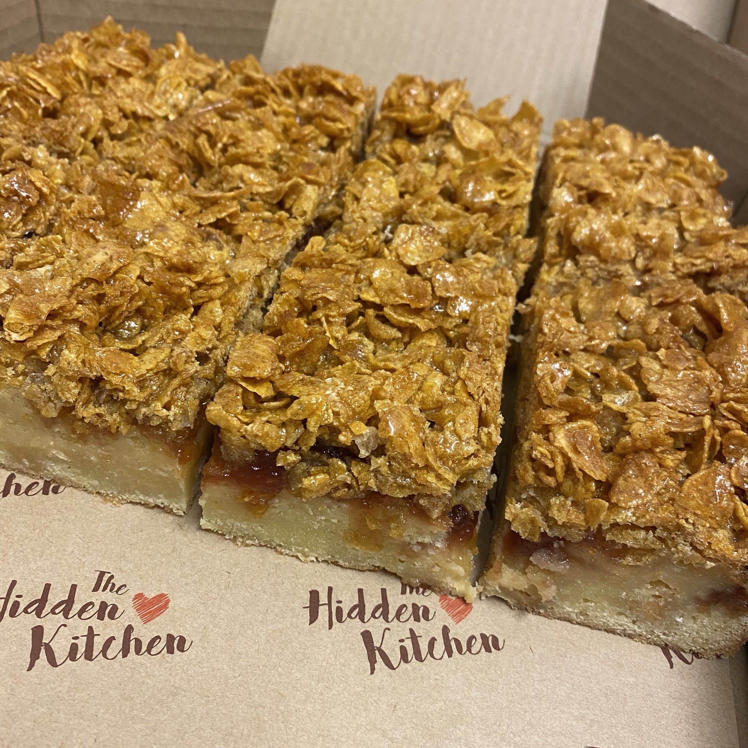 Ingredients – White Chocolate, Butter, Eggs, Sugar, Flour, Salt, Seedless Raspberry Jam, Cornflakes, Golden Syrup